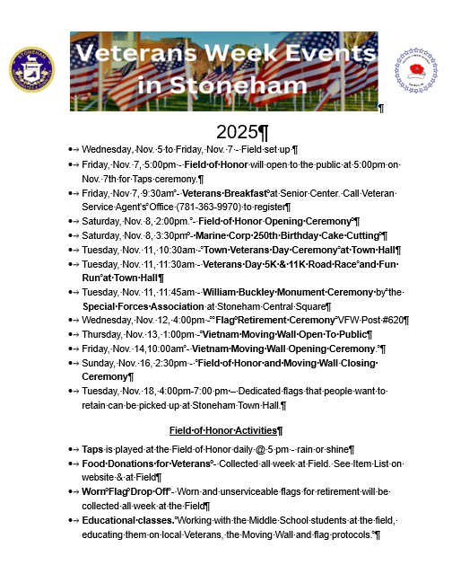 Veterans Day - 11/11 Ceremony at Town Hall (inside) at 10:30am. Thank you pins and cards will be given out to Veterans in attendance, from the Town of Stoneham. Pizza and drinks will be served to Veterans following the ceremony.